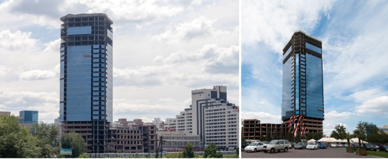 «Это уникальный объект для нашего города. Высота здания - 108 метров, внешняя оболочка на 95% состоит из стекла (площадь фасада - 10 733 кв.м). Облицовку объекта ведем с применением алюминиевых витражных конструкций «SСHUECO». Определенная сложность заключается в том, что часть каркаса смонтирована другим подрядчиком. Для максимального сохранения уже установленного фасада компания «КраспанМонтаж» предложила технологичное решение по усилению каркаса витражей. Завершить объект планируется в конце октября этого года», - отметил главный инженер проекта СПК Александр Емельянов.